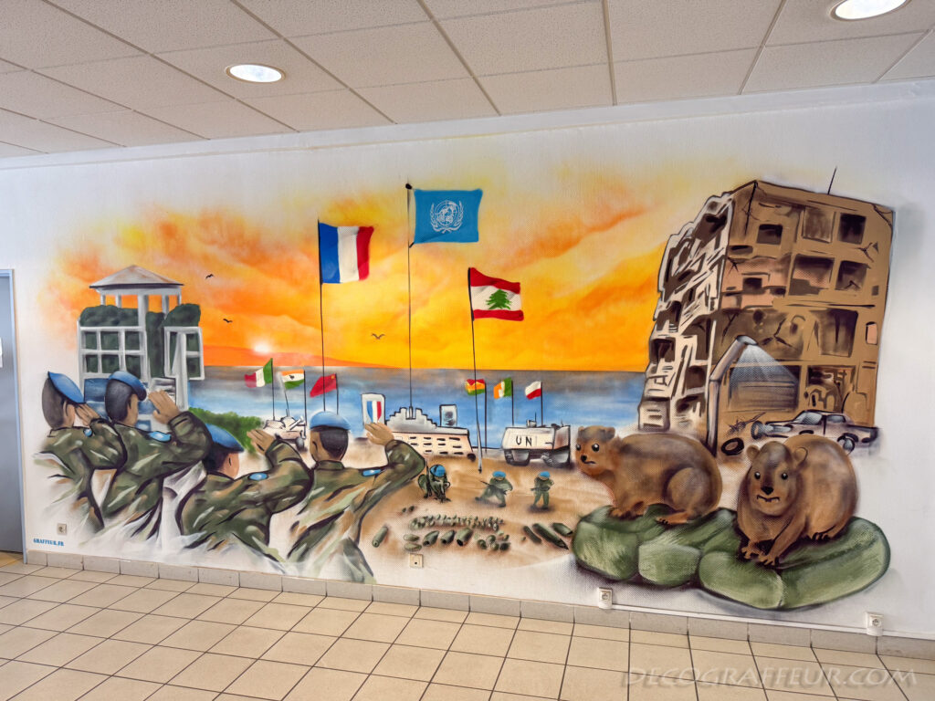 Réalisation sur mesure pour l’armée française – technique graffiti professionnel – thématique militaire – décoration murale intérieure – œuvre originale signée GRAFFEUR