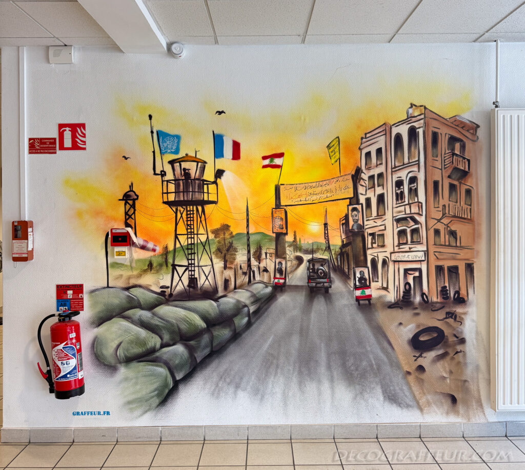 Cette fresque murale grand format a été réalisée entièrement à la bombe aérosol dans la caserne des Hussards de Metz. Elle rend hommage à l’engagement des soldats français en mission de maintien de la paix, notamment sous mandat de l’ONU. Sur fond de coucher de soleil vibrant, plusieurs soldats en uniforme saluent les drapeaux de la France, de l’ONU et du Liban, symbolisant la coopération internationale.